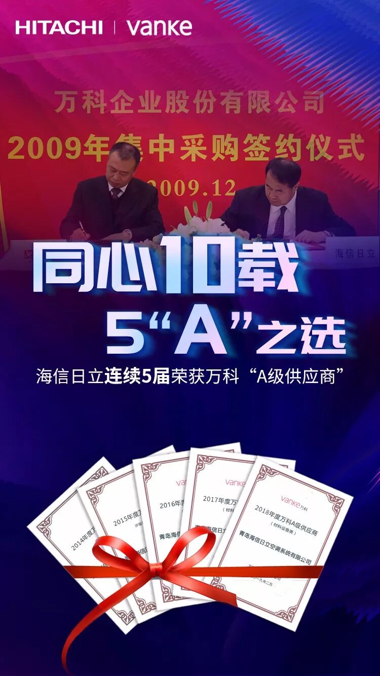 3月7日,在深圳万科总部举办的“凝聚同心 合伙共赢”万科集团合作伙伴春茗会上,国内地产界领军企业万科公布了2018年度A级供应商名单,日立中央空调再度荣获了材料设备类A级供应商称号。这也标志着日立中央空调成为空调类唯一连续五届蝉联该荣誉的中央空调品牌。